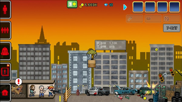 2、游戏操作极为简便:无需瞄准,也无需走位。只需点击屏幕,主角便会自动开火攻击来袭僵尸。击杀后掉落的金币无需手动拾取,系统会在几秒后自动收集。此外,升级解锁的道具会显示在屏幕右上角,点击即可使用,但所有道具均设有冷却时间。