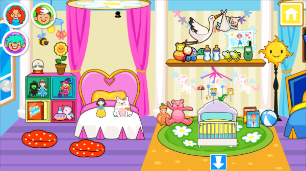 6、打造温馨可爱的卡通小家场景,包含多个功能区域,场景细节丰富且充满互动可能,视觉风格贴合儿童审美。