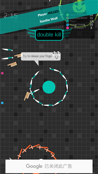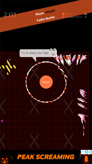 玩家不断的拾取新的飞刀,用飞刀来扩大自身的范围,这样能在游戏占据很大的优势,当自身的体积变得越来越大时,你不仅拥有自保的的能力,还能击杀其他玩家,让自己变得更加强大。尖刺破坏阵形是面对强敌时的最后一搏,被敌人包围,可以使用这个方法反败为胜,为了争夺第一名的位置,玩家们将要更加快速的操作圆圈移动,努力收集飞刀。