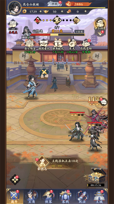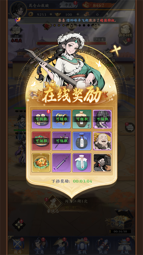 游戏的资源是通过【江湖历练】的放置挂机来获取的。同时可以派遣侠客探索武林秘境、剑冢遗迹等特色玩法,挑战守关高手,获取稀有武学秘籍和神兵利器。