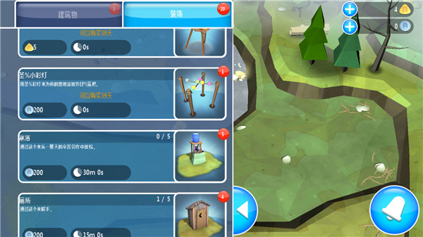 1、游戏核心围绕建筑与资源采集展开。建筑分为实用性与装饰性两类,其中装饰类建筑可随时出售换取资源。