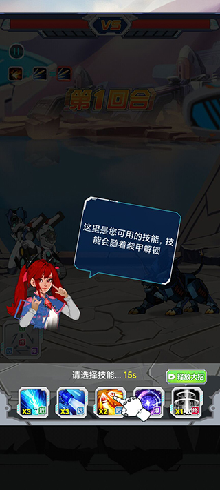 10、屏幕下方显示当前可用技能,技能随机甲装甲解锁逐步开放;