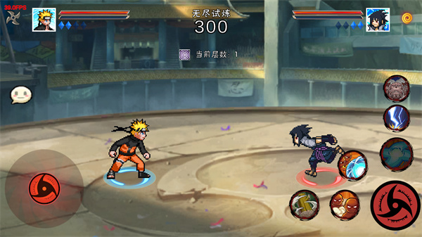 6、通过虚拟按钮控制角色在场景中移动,上下左右都行,在对战的时候可以使用右边的忍术,不过每个忍术都有冷却时间,使用的时候需要留意时机。