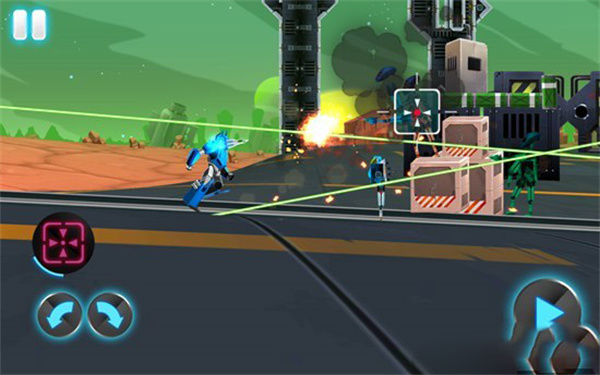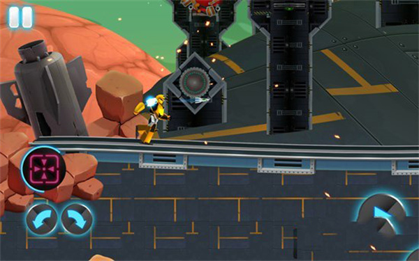 3、当受到攻击时,点击屏幕左侧的“人物形态”按钮即可变身为机器人。此时该按钮将切换为攻击键,点击即可发射导弹打击前方敌人。