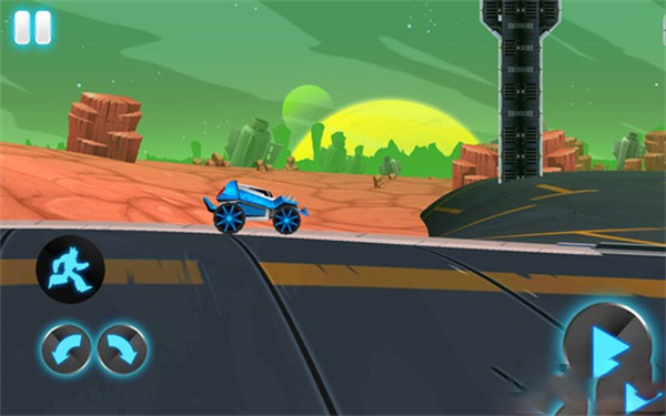 1、进入游戏后,你将操控一辆类似玩具车的载具前行。点击屏幕右侧形似“播放”按钮的控件即可向右加速;左下角设有两个箭头按钮,分别控制车身前倾或后仰,帮助你调整行驶姿态以应对复杂地形。