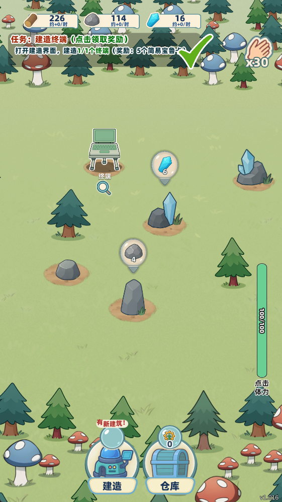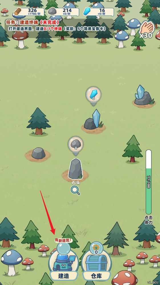 3、回到基地时,可以点击地图中的树木或石头进行砍伐和开凿,从而快速获取建设所需的材料;