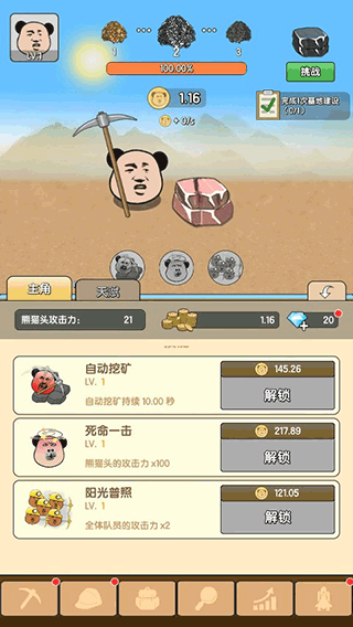 2、主角熊猫头初始手动挖矿。等级提升后,能招募矿工伙伴。他们自带技能,比如精神小伙加快采集速度。