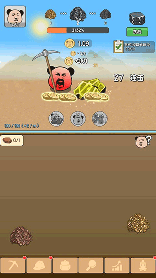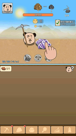 3、在底部的导航栏中,不同图标代表着不同的玩法与功能,如点击镐头可以升级熊猫头的攻击力,提高挖矿效率,若手动点击太累则可以解锁自动挖矿等强力“技能”。