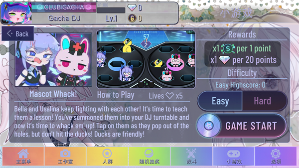 与打地鼠类似的模式,在这个小游戏中Bella和Usalina会从界面中的DJ工作台上左右两个碟子中的6个孔出现,其中还包括鸭子。
