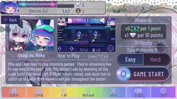 在这个小游戏中玩家需要操控界面上代表Mily的准星,左右移动或冲刺来射击出现的代表Lado的敌人。