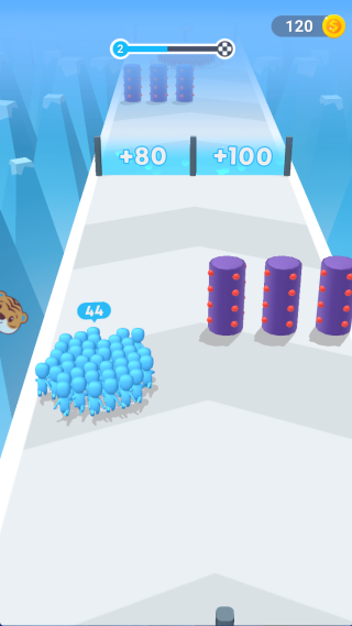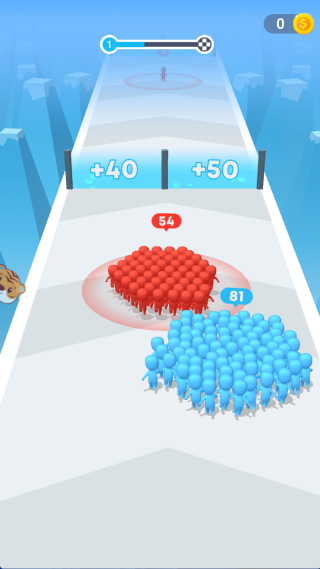 1、点击屏幕左右滑动,控制角色移动,在场景中不断的成长更多的人数。