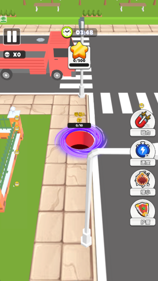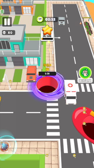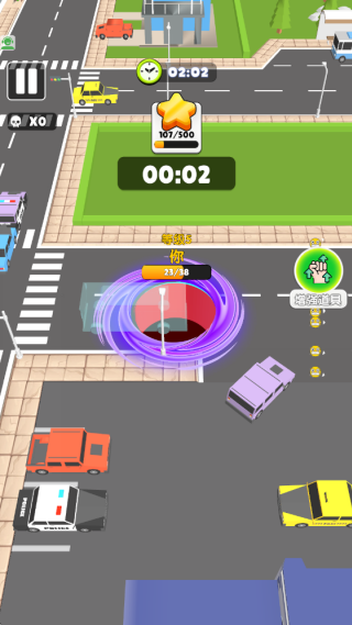 2、在街区移动,在规定的时间内吞噬有限的物体,成功的扩大黑洞的体积,吞噬更多物品。