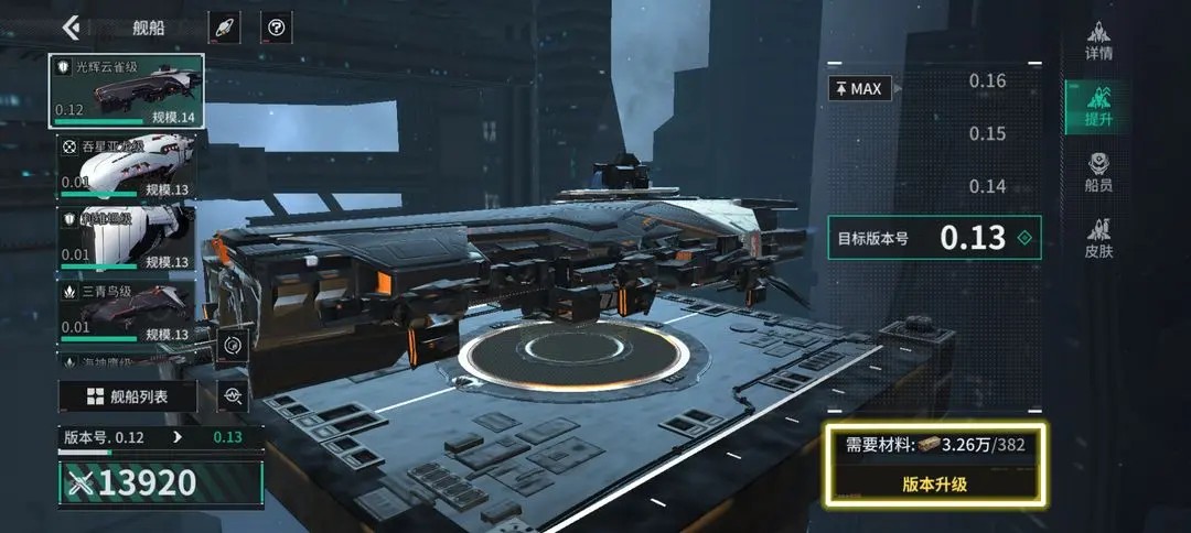 在舰船界面中,可通过右侧操作栏对战舰进行升级,提升其整体性能。升级时可选择指定的版本号进行快速升级。