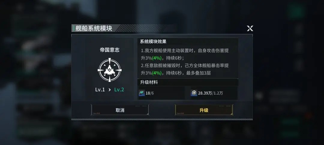 同时,对应的系统模块也会解锁,点击该模块进行升级可提升舰船作战能力。