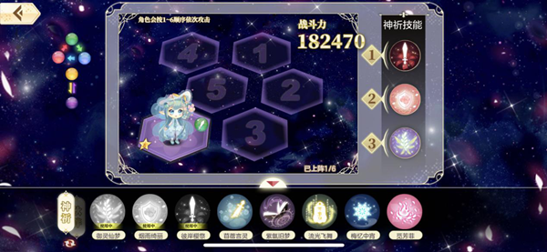 123是前排,456是后排。123建议放生命值高点,闪避点高。奶可以放在1或者2,盾可以放在1或者2。奶也可以放在后排。6是主角(神祈)。根据神祈来变换阵型。