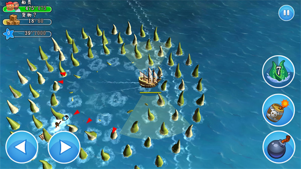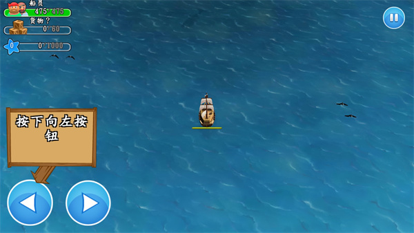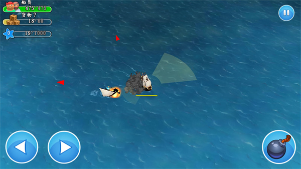 3、操作延续系列传统:大地图上点击格子移动,每步消耗行动值;点击建筑或船队可选择进港或海战。战斗采用虚拟按键控制方向,结合重力感应调整船体朝向,进入射程后点击炮弹图标发射。战舰升级后解锁技能,需密切关注血量、水手数、货物与行动力,及时补给。