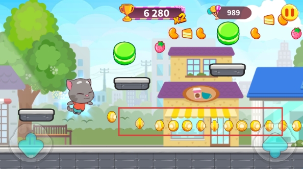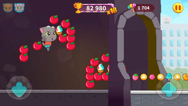 而玩法上主要通过操控汤姆猫来进行更远的跑酷,左侧下滑,右侧跳跃灵活搭配让自己跑的更远,获得的糖果更多,期间背景交替频繁,途中障碍陷进众多,而你需要克服困难让自己跑的更远。