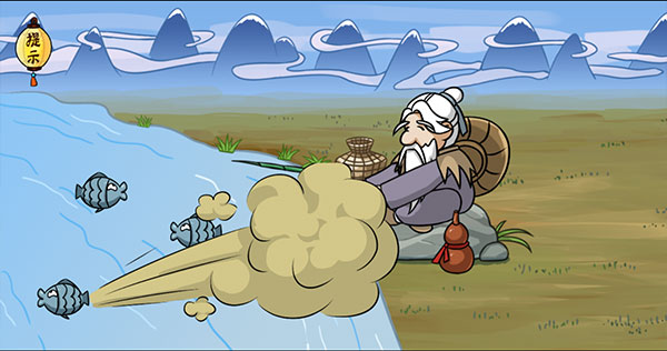 当底部的鱼向左游动时,连续点击鱼身两次,鱼会放屁;臭气激怒姜子牙,使其跳入鱼塘中完成关卡。