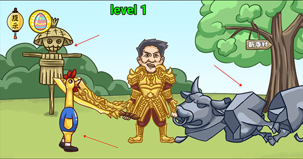 将青年拖至画面中央,先击败石牛获得黄金甲和屠龙刀;将武器强化至+6后攻击稻草人,引出隐藏大佬并将其击败即可通关。