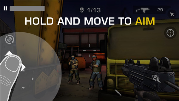 1、进入战斗后,滑动左侧虚拟摇杆控制角色移动与瞄准目标,点击右侧按钮即可开火射击。