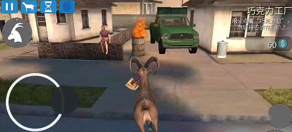 取得面包后,系统提示需用火点燃。马路对面已有燃烧的油桶。由于面包被舌头卷住难以直接接触火焰,可让山羊在油桶前跳跃或左右晃动,使面包摆动触火,重复几次即可成功点燃。