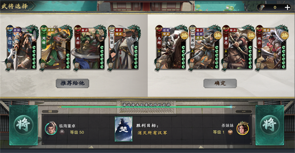 选人界面会从自身武将库中随机出4名武将,如果对武将不满意,可用换将令进行替换。在这个界面可查看自己与队友的选人界面,点击队友武将可为其推荐。