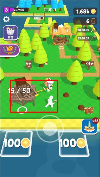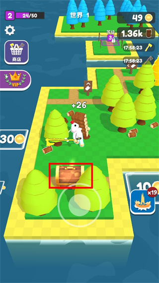 1、进入游戏后,使用屏幕下方的虚拟摇杆控制角色移动,开始采集木头资源。