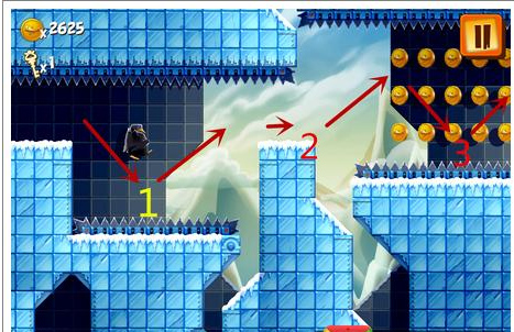 1.在企鹅下落到1的位置时,手指在屏幕上往上滑,让企鹅跳到小平台上。