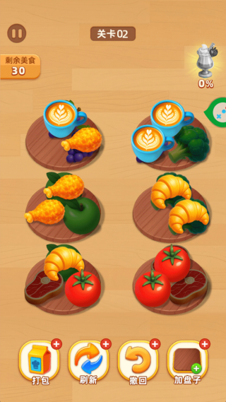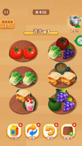 1、点击关卡中的食物,拖动放置到同一个餐盘中,三个相同食物即可合并消除。