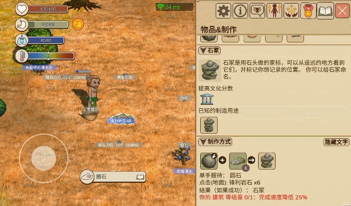 ②将枯枝放在地上后,手上需要拿着燧石刀刃点击地上的枯枝进行交互。即使制作失败也可以继续点击直到制作完成。