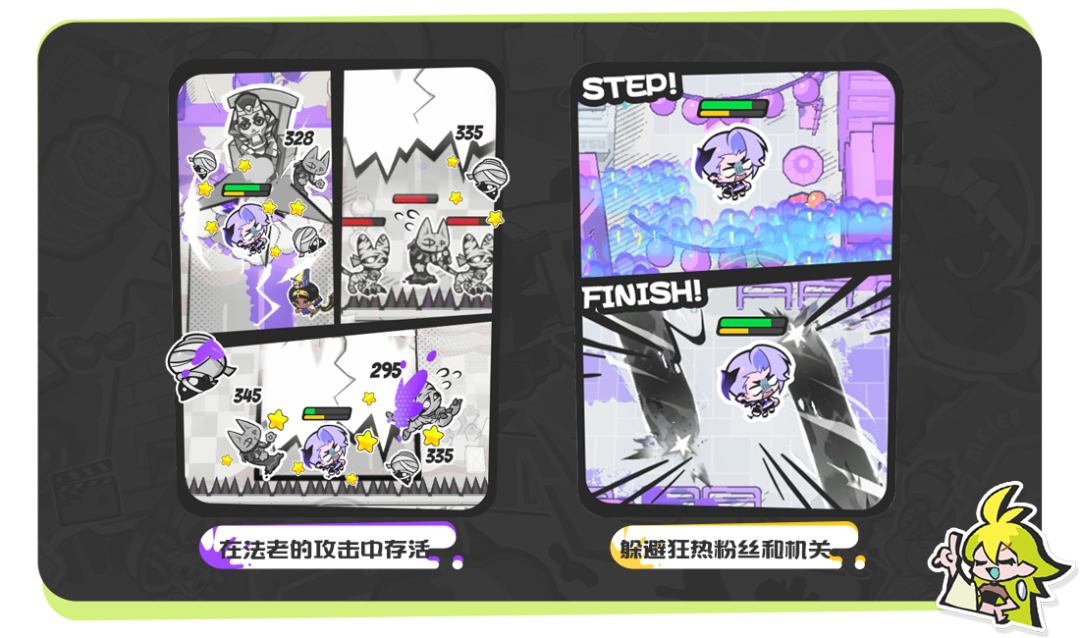 此外,游戏内也设计了一些特殊关卡,比如危险的生存关卡,拉美西斯的试炼将在你踏入金字塔的那一刻启动,需要尝试在法老权杖的威光之下闪转腾挪活到最后。或者让人心跳加速的躲避关卡,当霓虹的狂热粉丝循着爱豆的光芒向你们追来,努力带着爱豆逃走吧~