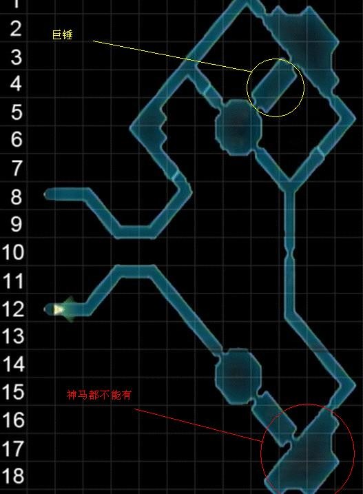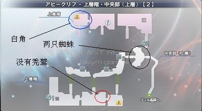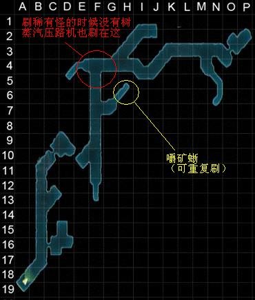 蓝圈刷怪点,非常远且坑爹,大概路程是:上层出门坐电梯去下层,然后去下层地图右下的电梯(下层唯一一个电梯)去中层,然后从中层绕一圈进门,出门去地图上方的电梯,最后进门左拐开门就是,判断依据很复杂,首先进图黑圈是2只蜘蛛,然后在电梯那往下看只有一只魂之主,然后左边进门红圈处没有刷秃鹫,那么跑到刷怪点一般都会有