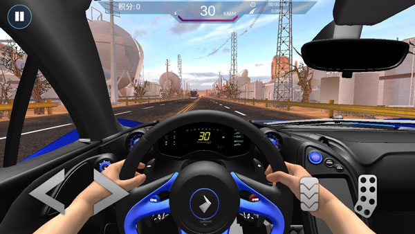 准备工具就绪之后,然后就是真正的驾驶主题了,进入游戏模拟画面,在这里会有不同的汽车在车道上,玩家要根据实际情况决定是否可以超车,倘若超车条件不具备则游戏结束。关于游戏中的驾驶操作,看图,左侧代表着驾驶控制方向,右侧则是驾驶的油门和刹车。