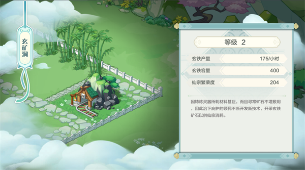 描述:因铸炼灵器所耗材料甚巨,而且寻常矿石不堪敷用,因此治下庇护的领民不断开发新技术,开采玄铁矿石以供仙宗消耗。