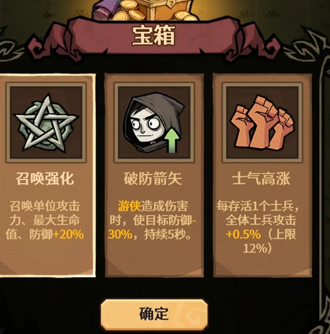 3、金币上前期优先扩建,升级和宝箱奖励先拿改善农具和高效生产,越早越好。召唤强化是刚需,龙属于召唤单位,可以吃到加成,其余宝箱奖励推荐祭司和泰坦的以及所有伤害强化,远程强化。