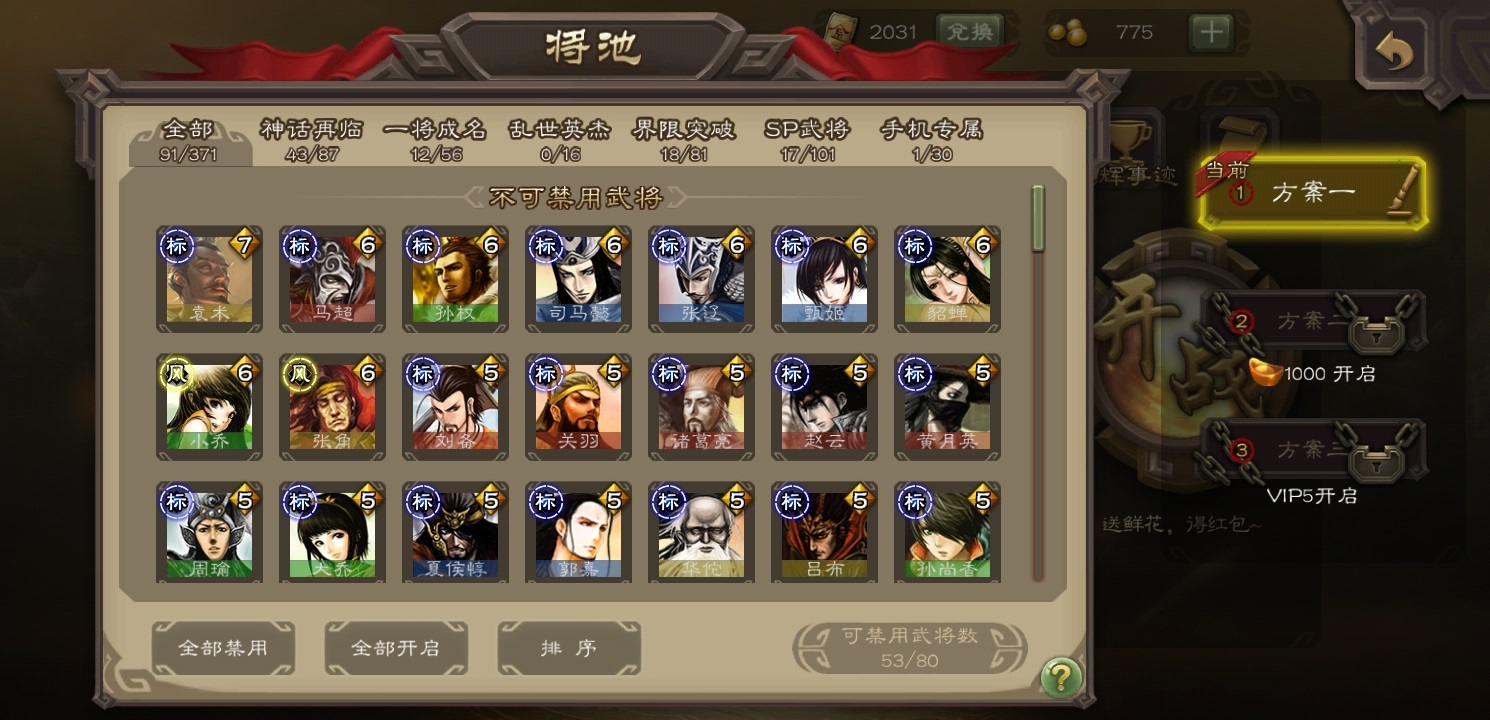 进入之后是这么一个页面,这个页面不止能查看将池以及你能够使用的武将,还涉及一个模式禁将的设定。不过排位赛不能禁将。