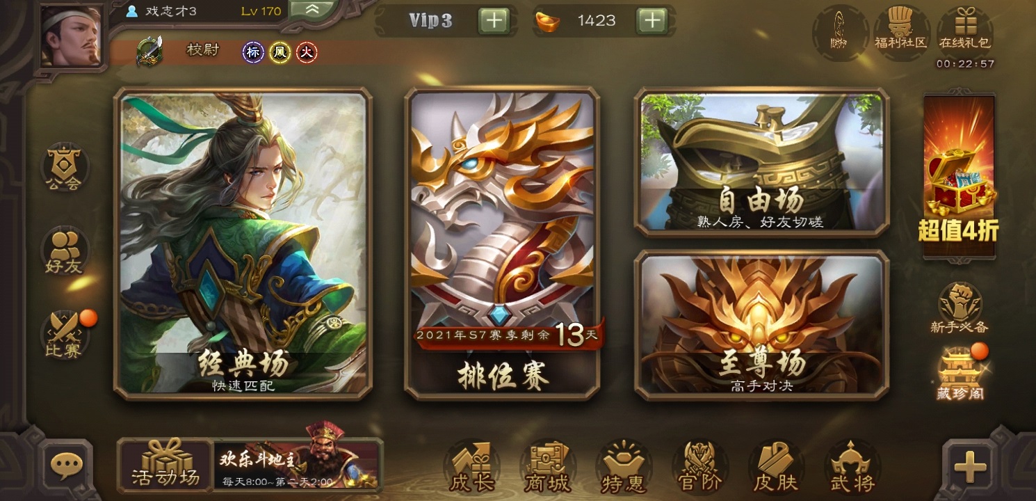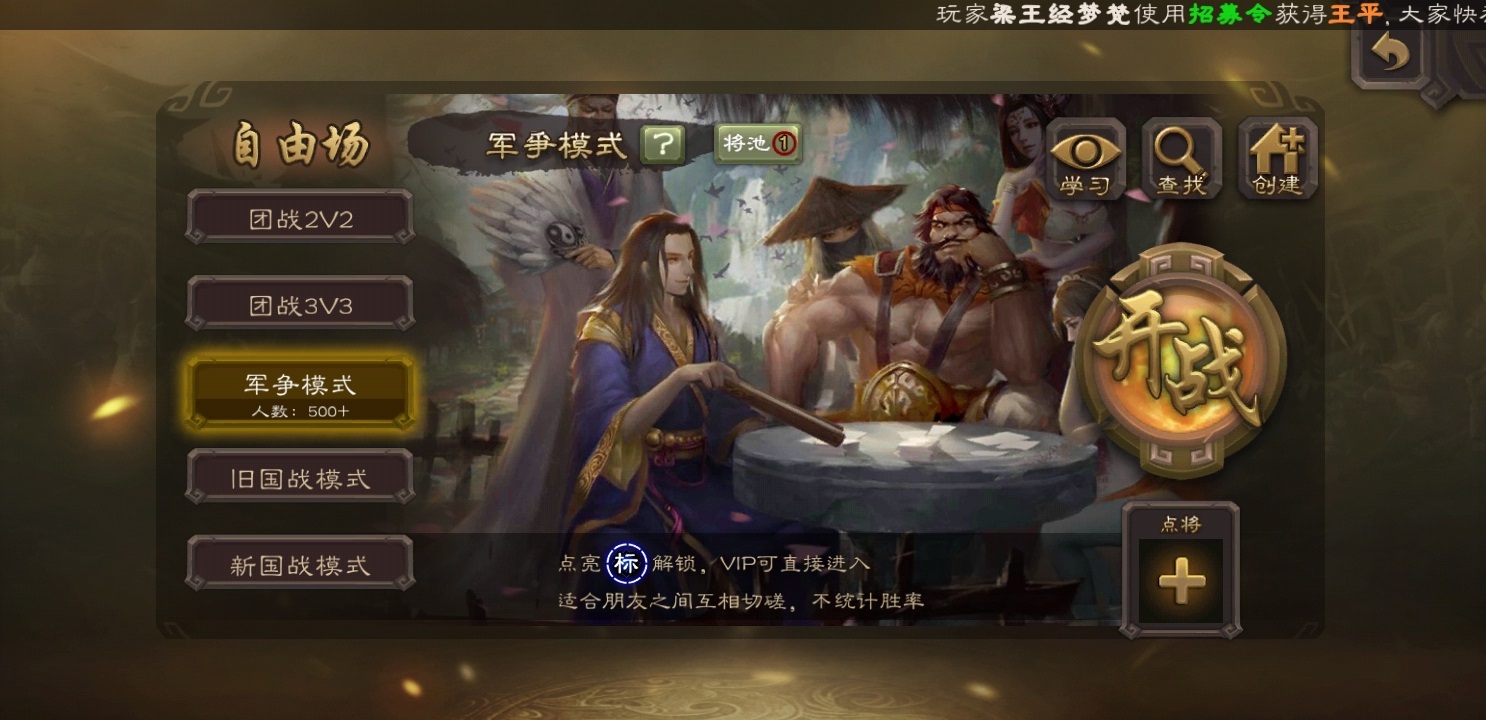 首先自由场,自由场当中能够体验到的玩法和模式很繁杂,最特别的就是在很久以前三国杀的主流玩法,比如3V3,据我所知在以前排位赛就是3V3。