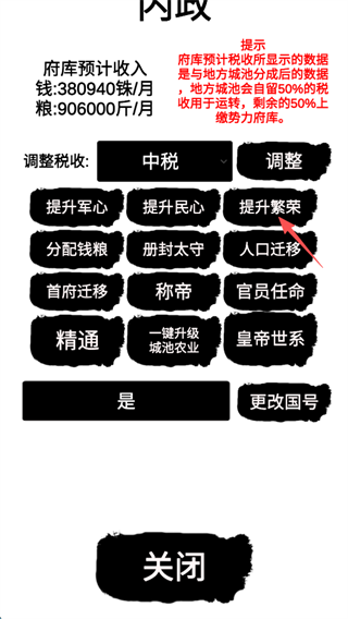 8、其中主要提升己方势力的繁荣,可以提升己方的每月收入,游戏中大部分的行动都需要消耗资金。