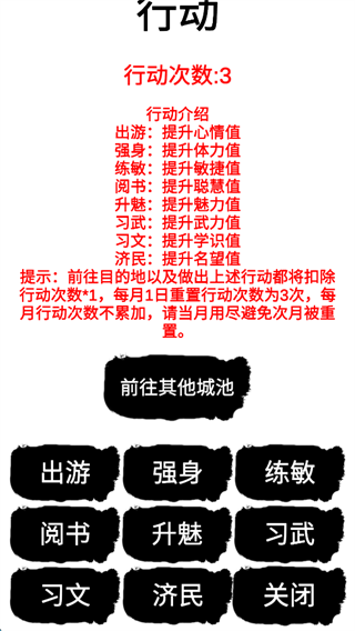 10、行动可以帮助角色提升相应的属性值,帮助角色变得更加强大,以便在乱世之中有自保之力。