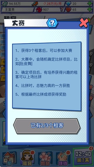 属性碾压:在大赛前,集中资源培养租客的兴趣和魅力,确保在PK大赛中获胜,赢取丰厚奖励。