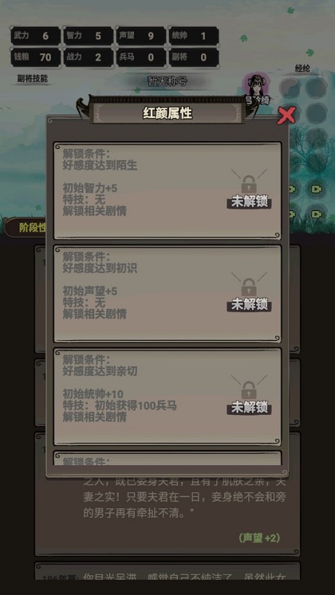 3、大量文本记录的详细描述,将展示你这一路的成长历程,期间会有不同选项可供玩家选择,这会影响你在武力、智力、声望和统帅上的能力。游戏内额外附赠了钱粮、战力、兵力以及副将条件。