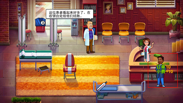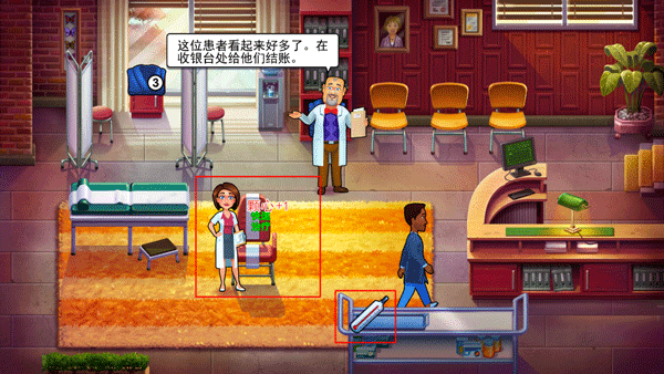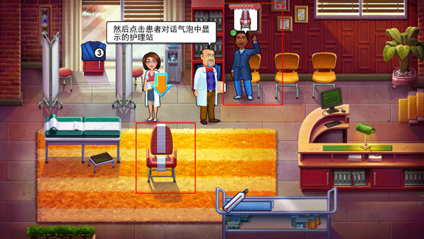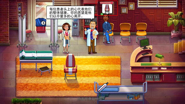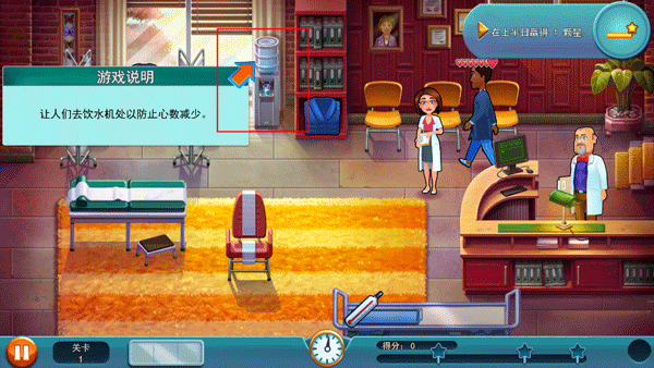 4、第一关非常简单,每位患者头上的心代表它们的整体健康,你的工作就是让他们以尽量多的心离开医院,同时病人的头上会显示要做的事。