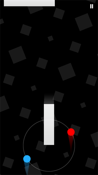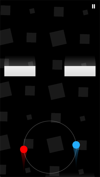 2、上手容易精通难的游戏才是好游戏。二重奏也是,点击屏幕左侧,则两个圆球绕着白色的轨迹逆时针旋转,右侧则是顺时针。在旋转中不断避开下落的白色方块。看似简单,但是想要玩的好,难,很难,非常难。