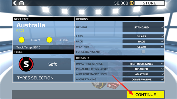 2、可以选择游戏开始的轮胎类型,天气,圈数等等,随后点击“CONITNUE”。