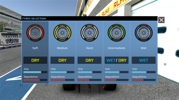 为每场比赛选择您的策略。您可以在每场比赛开始和进站时选择要安装的轮胎类型(软胎、中胎、硬胎、中等胎和大雨胎)。