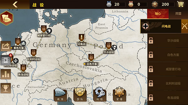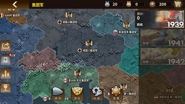 1、部署集团军部队,每个国家有其专属科技卡牌,通过科技卡牌加速征服世界的进程。