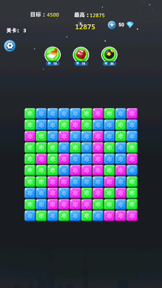 4、点击选择相邻的同色星星,连接数量越多得分越高,消除后上方星星会下落填补空缺,产生新的消除机会。