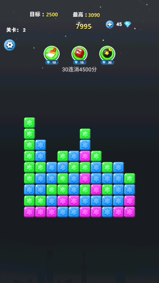3、每个关卡消除到最后无法消除的时候,即结束,达到目标分数过关。
