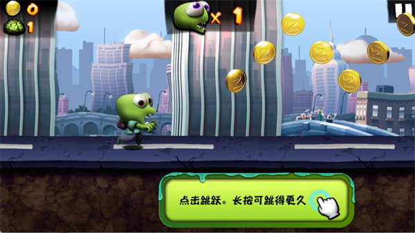 2、进入游戏后,你需要操作僵尸进行跑酷,长按屏幕跳过各种深坑