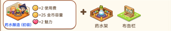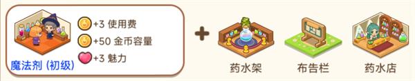5、魔法剂(初级)药水架+布告栏+药水店使用费+3、金币容量+50、魅力+3